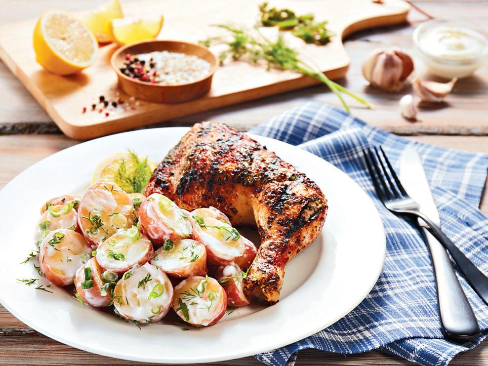 Let your chicken legs marinate while you prepare the fresh herb potato salad using a light, non-fat yogurt made with Canadian dairy. Enjoy this Mediterraneaninspired meal as you soak up the last of the warm weather.