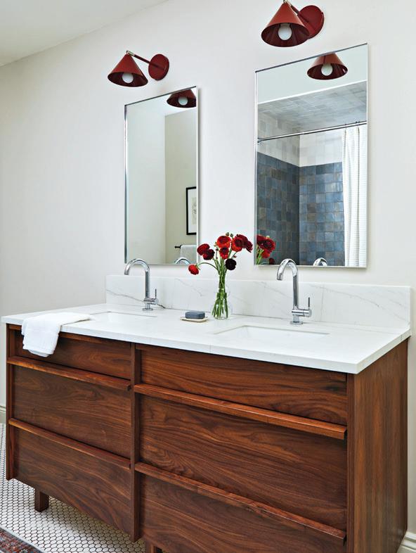 “The deep red sconces offer a subtle hit of colour and if the client wants a change, it’s not difficult to swap out later.”