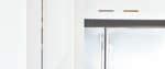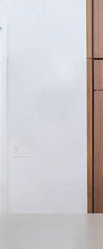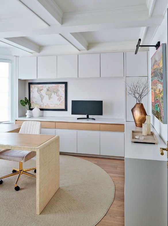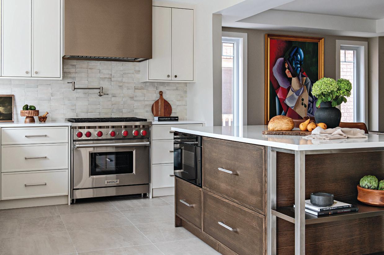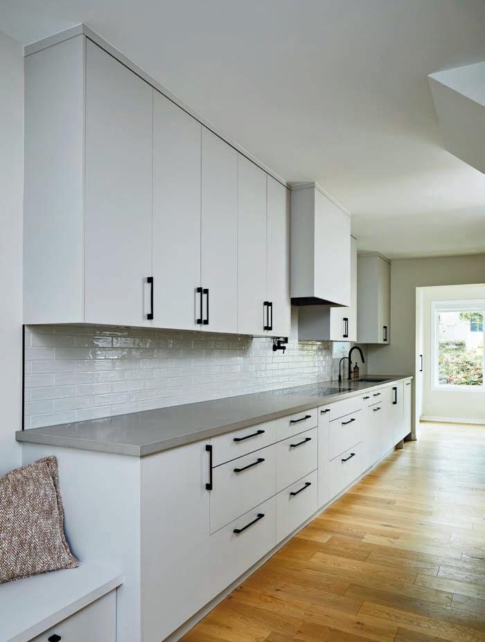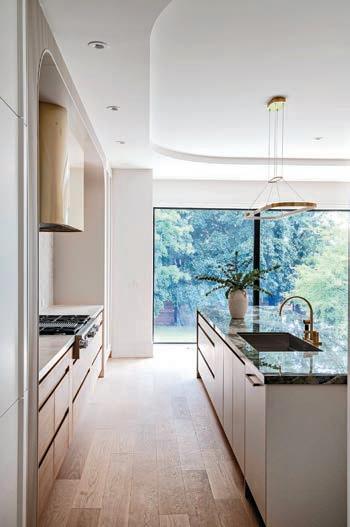 two walls. One had been replaced with floor-to-ceiling windows, and the other was taken down to accommodate the openconcept layout. This left only two perpendicular walls to house the essential kitchen functions. The design also had to ensure the kitchen faced the backyard view through the large windows, while maintaining a seamless visual connection to the family room and its central fireplace. Balancing the kitchen’s significant width within the bright colour palette added another layer of complexity, requiring careful consideration to achieve harmony and proportion.