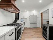 The stove area is framed with custom millwork, creating a cohesive and refined look that complements the island’s design. The combination of flat panels, patterned millwork and white oak brings a balance of brightness and warmth. Natural light streaming through the windows interacts with the millwork, reflecting in unique ways and enhancing the kitchen’s inviting ambience. The backsplash, crafted from durable porcelain slabs, blends beauty and functionality, offering easy maintenance. The brass-finished range hood with a powerful yet silent ventilation system adds a touch of elegance, tying in nicely with the ceiling fixture and faucets.