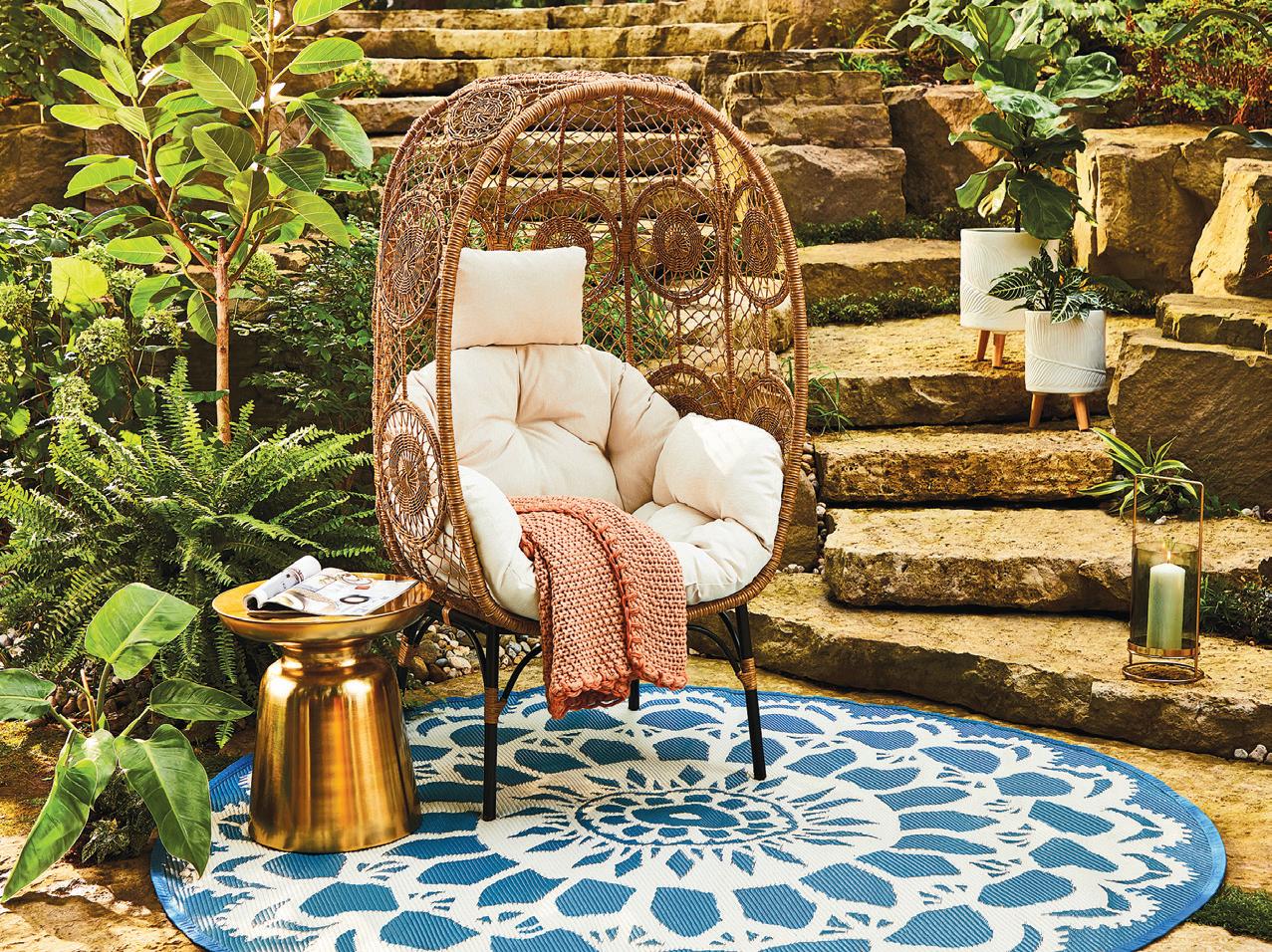 Boho wicker egg patio lounge CHAIR by Hampton Bay. $438. | Side metal STOOL with gold finish by Hampton Bay. $90. homedepot.ca