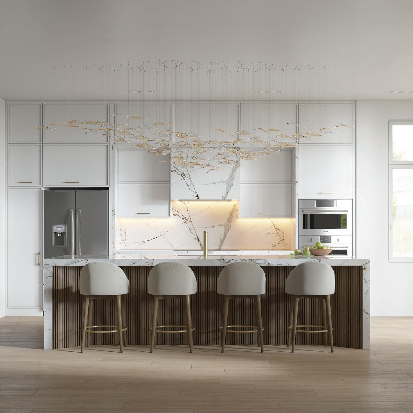 Maximizing the unconventional 10’ ceiling height in this kitchen was the turning point of its transformation to bright, modern elegance. Subtle touches of natural wood to calm the space and mixed metals offer a timeless appeal.