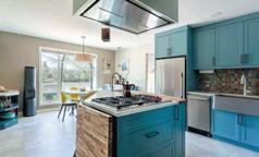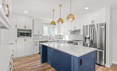 We transformed a dated 90s kitchen by removing walls and installing a beam to create an open, modern space. Bold blue and white cabinetry, quartz countertops, and a spacious island now make this kitchen perfect for gatherings and everyday living.