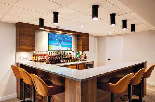 The basement renovation features a sports bar ambiance that includes an upgraded bar with stools and all the implements for drink mixology and a gigantic TV perched above.
