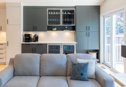 A coffee bar was reimagined adjacent to the living room. The flat panel cabinets are painted charcoal grey within a primarily white kitchen and living space and contribute to a seamless flow throughout.