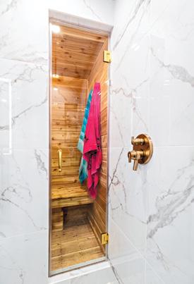 Cedar sauna with an entrance from the shower. This was done to have direct access to the shower but also has the added benefit of allowing us to put the sauna in the old shower location & keep the toilet plumbing in the same place.