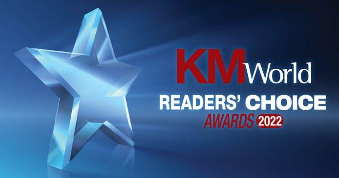 A principios del mes de noviembre, la revista KMWorld anunció a los gana dores de los premios KMWorld Rea ders’ Choice Awards 2022. Fueron 13 las categorías del certamen y estas incluían el reconocimiento a la gestión de procesos comerciales, computa ción cognitiva e IA, servicio y soporte al cliente, descubrimiento electrónico, gráficos de conocimiento, análisis de texto y NLP.