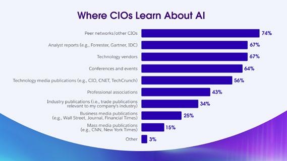 A medida que buscan desarrollar experiencia en una tecnología que avanza rápidamente, los CIO recurren a fuentes de información conocidas como firmas de análisis, proveedores de tecnología y medios especializados. Sin embargo, los CIO confían más en sus pares de otras empresas sobre este tema, una tendencia que el propio CIO de Salesforce ve con buenos ojos.