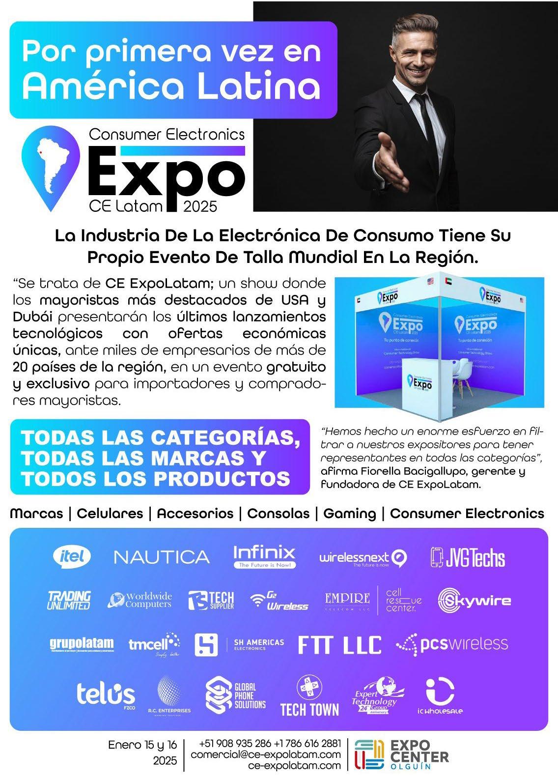 El 15 y 16 de enero de 2025, se realizará la primera feria de Consumer Electronics: el CE ExpoLatam Show, que se realizará en el Centro de Convenciones Expo Center Olguín, y estará dirigido a los importadores del Perú y América Latina que estén interesados en importar desde Estados Unidos y Dubái.