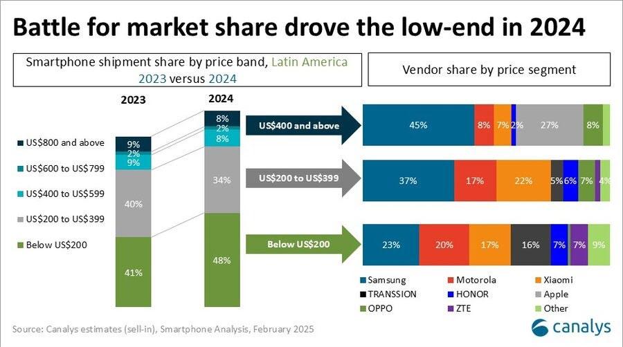 “Desde una perspectiva competitiva, el mercado latinoamericano de smartphones en 2024 se caracterizó principalmente por una batalla por participación de mercado en unidades”, agregó Pérez. “Los proveedores históricos dominantes, Samsung y Motorola, lucharon por recuperar el terreno perdido frente a fabricantes chinos como Xiaomi y Transsion, quienes continuaron consolidando su presencia en la región al ganar participación de mercado a las marcas establecidas. Esta dinámica significó que el mercado en disputa fue el segmento de precio inferior a US$ 200, lo que explica el aumento del 94% en unidades enviadas a la región en comparación con 2023. Así, el aumento significativo de la competencia en el mercado latinoamericano de smartphones ha sido impulsado por un fuerte enfoque en la relación precio-calidad. Esto restringe la rentabilidad de los fabricantes y los canales de venta, al tiempo que limita las oportunidades de generar nuevas fuentes de ingresos a través de la adopción más amplia de tecnologías móviles de vanguardia en el mercado”.