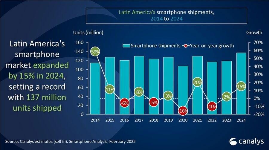 El último estudio de Canalys revela que el mercado latinoamericano de teléfonos inteligentes creció un 15% en 2024, logrando un envío récord de 137 millones de unidades. Este crecimiento fue impulsado por una recuperación en la demanda de dispositivos, generada por un ciclo de reemplazo y ofertas comerciales agresivas de los fabricantes.