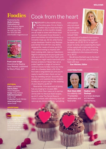 extra special, why not whisk away the apple of your eye for a romantic retreat? With our round up of Scotland’s top country house hotels, planning a trip couldn’t be easier, pp.33-35. Or, for a night out closer to home, we’re exploring the heart of the capital with a little help from the Edinburgh Trams, p.51, plus, reviewing new additions to the restaurant scene on p. 56-57. We all know the best way to the heart is through the stomach, so this month, feast with love. Sue Hitchen, Editor CONTRIBUTORS
