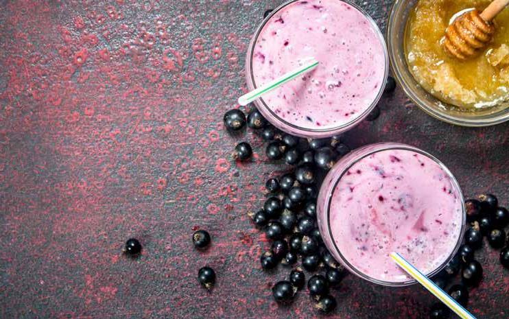 Zutaten pro Cocktail: 1 Eigelb 2 cl schwarzer Johannisbeernektar ¼ l kalte Mich 1 EL Honig