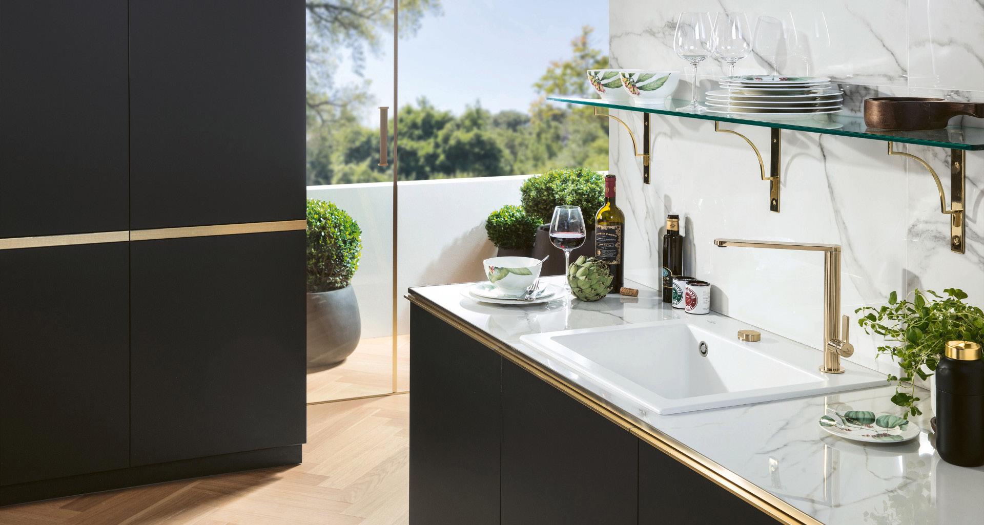 Armaturen in Gold sorgen für einen eleganten Schimmer in der Küche