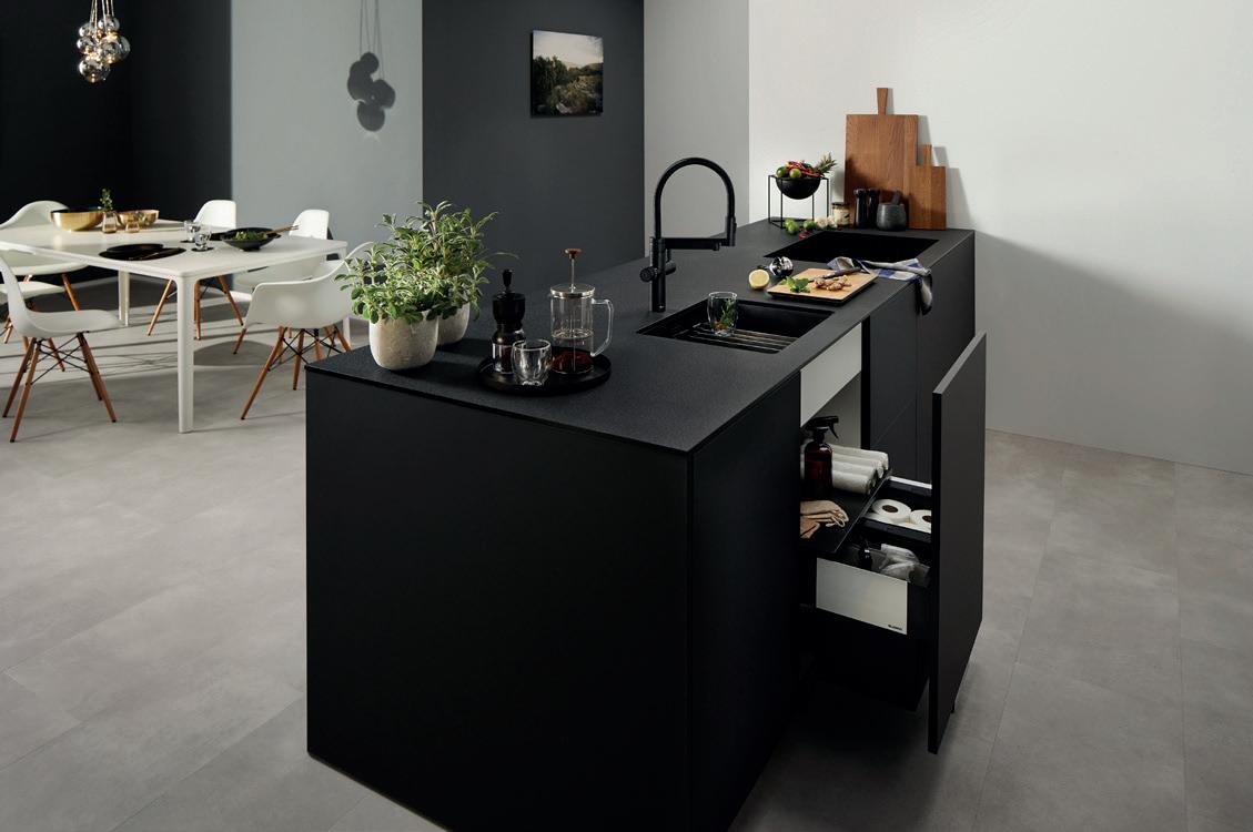Der Armatur oder dem Wassersystem kommt bei der Küchengestaltung mit schwarz eine ganz besondere Rolle zu. Ob in der modernen Küche, im ausdruckstarken Industrial Style oder den lässigen Skandinavien-Look – im Blanco-Sortiment findet Jede und Jeder das Richtige. Neue Modelle, wie die multifunktionale Serie EVOL oder beliebte Klassiker sind in der Oberflächenausführung schwarz bzw. schwarz matt erhältlich. Unzählige Kombinationsmöglichkeiten ergeben sich mit passenden schwarzen Becken und Spülen. Für das perfekte Zusammenspiel sorgt zum Beispiel die beliebte Beckenserie ETAGON aus Silgranit ® oder Keramik. Viele weitere Modelle stehen zur Wahl.