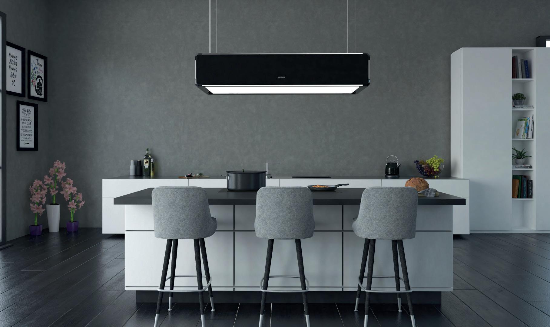 (epr) Insbesondere zu Hause gehört die richti ge Atmosphäre zum sti lvollen Essen einfach dazu – und dank modernster Küchenausstattung ist es jetzt auch leicht wie nie, dieses Flair im eigenen Kochtempel zu kreieren. So sorgt die höhenverstellbare Umluft -Deckenlift haube „Lightline“ von Silverline nicht nur buchstäblich für gute Luft beim Dinieren, sondern erzeugt dank ihrer Ambiente- und Eff ektbeleuchtung auch eine faszinierende Lichtsti mmung. Die hochwerti ge Haube kommt dabei in ästheti schreduziertem Design daher, saugt Kochdünste effi zient und leise direkt über der Kochstelle ab und lässt sich zudem mühelos vom zuverlässigen Abzugs- in ein beeindruckendes LED-Licht-Objekt verwandeln. Doch mehr noch: Ausgestatt et mit der Silverline Hi+ Technologie ist „Lightline“ für eine smarte Gerätevernetzung vorbereitet und lässt sich komfortabel via App steuern. Das impliziert sowohl die Höhenverstellung der Abzugseinheit samt Leistungsregulierung und einer Air-Refresh-Funkti on als auch die voneinander unabhängig steuer- und dimmbare Ambiente- und Kochfeldbeleuchtung. Weiteres Komfort-Plus: Aufgrund der integrierten Hob2Hood-Technologie kann der Dunstabzug sogar mit dem Kochfeld selbst vernetzt werden – und garanti ert so immer eine opti male Geruchsabsorbierung. Bei gewählter Auto-Mode-Funkti on steuert das Kochfeld die Intensität der Haube selbstt äti g, und zwar stets angepasst an die eingestellte Herdleistung. Das Ganze funkti oniert bequem via Bluetooth und sogar herstellerübergreifend mit allen geeigneten, autark steuerbaren Kochfeldern. Die Küche komfortabel und wahrlich geschmackvoll ins rechte Licht rücken? Mit „Lightline“ ein Leichtes. Mehr unter www.silverline24.de.