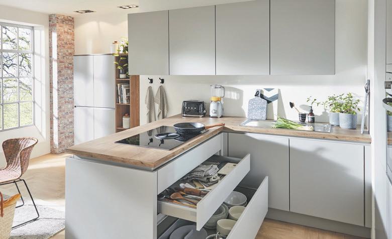 (epr) Wer eine neue Küche plant, denkt zunächst an schicke Fronten, moderne Elektrogeräte und Schränke mit reichlich Stauraum. Perfekt wird der Küchenspaß aber erst, wenn auch das Lichtkonzept stimmig ist, alle Anschlüsse richtig platziert sind und die Küchenform zum Grundriss passt. Bei einer eher kleinen Küche unter 15 qm bieten sich platzsparende Lösungen wie eine Küchenzeile, eine zweizeilige Küche oder eine L-Küche an. Für eine Küche in U- oder G-Form bzw. mit integrierter Kochinsel benötigt man eine größere Grundfläche. Diese Formen sind außerdem besonders schön bei offenen Wohnkonzepten, bei denen der Koch- in den Essbereich übergeht. Ein ebenso wichtiger Aspekt sind die Anschlüsse für Strom, Wasser und eventuell Gas. Generell gilt: Lieber mehr Anschlüsse als zu wenige. Versenkbare Steckdosenleisten, die in Schränken und Auszügen liegen, schaffen Flexibilität ohne wertvollen Platz wegzunehmen. Im Bereich der Arbeitsplatte empfehlen sich Zweifach- oder DreifachSteckdosenkombinationen, da hier oft viele Kleingeräte wie Toaster, Kaffeemaschine, Wasser- und Eierkocher zum Einsatz kommen. Das richtige Lichtkonzept macht die Traumküche vollkommen. Zum Kochen selbst ist kälteres Licht besser. Dimmbare und LEDLeuchten schaffen dennoch eine gemütliche Stimmung und sparen zudem Strom. Arbeitsflächen lassen sich durch eine zusätzliche Zonenbeleuchtung gut ausleuchten. Diese können auf der Unterseite der Oberschränke montiert werden. Die Überstände von Küchenschränken eignen sich ideal als Akzent- oder indirekte Beleuchtung. Die Küchenprofis von KüchenTreff freuen sich, gemeinsam Ideen zu entwickeln und beraten gerne. Mehr unter www.kuechentreff.de.