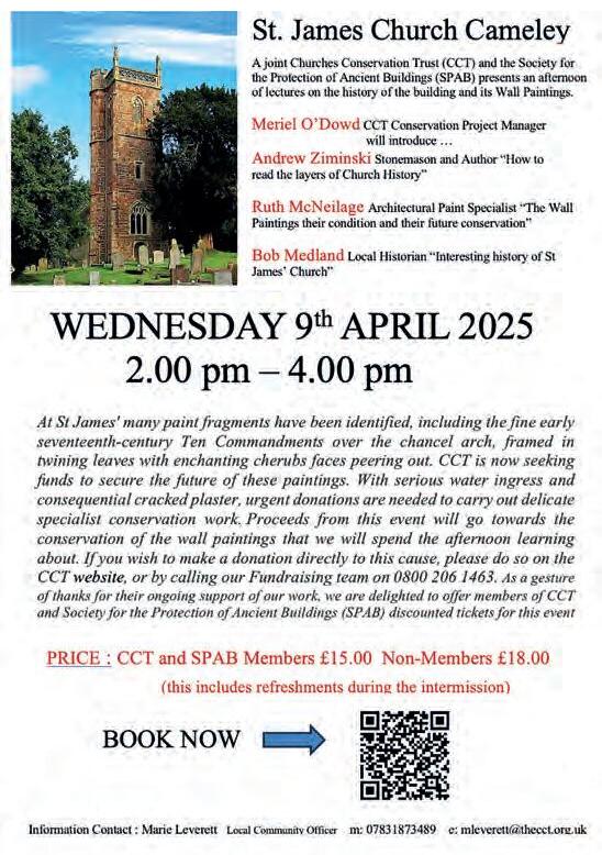 Wells Folk & Barn Dance Club 7.30-9.30pm St Thomas’s Church Hall, BA5 2UZ. All welcome: 3rd & 4th Wed this month. Details: wellsfdc.co.uk Pensford Soup Lunch 12 to 2pm, Old School Room. All welcome. Details: Jane 07780 677253. Somerset Vernacular Research Group talk by Jenny Chesher from Historic England on her parents’ restoration of their Cornish house, 7.30pm Somerton Parish Rooms TA11 7NB. Visitors £2. Details: www.svbrg.org.uk