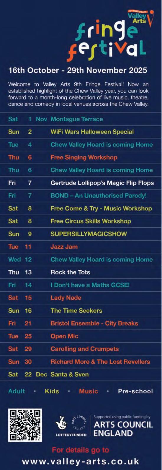 Shipham Charity Lunch, 12.30pm village hall, fortnightly. Soup, bread, cheese, pickle, tea/coffee, biscuits. £5.50, U5s free. For Save the Children. “I don’t have a maths GCSE” Mia Borthwick’s musical comedy journey. 8pm Old School Rooms, Chew Magna. Details: www.valley-arts.co.uk
