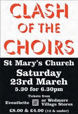 Clash of the Choirs, St Mary’s, Wedmore, 5.30 for 6.30pm. Details: 07984 924432. Nempnett Thrubwell parish breakfast, 10am-12noon. Details: jamesteach_55@yahoo.co.uk