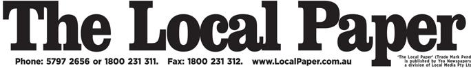 1800 231 311, 0450 399 932 editor@LocalPaper.com.au Your business can have front-page prominence in a local edition of The Local Paper for just $28 per fortnight if you order a 23-issue pre-paid package totalling $644. Limited offer. First-in basis.