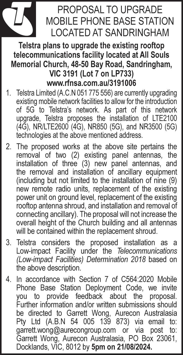 In accordance with Section 7 of C564:2020 Mobile Phone Base Station Deployment Code 2020, we invite you to provide feedback about the proposal. Further information and/or comments should be directed to: Vanessa Wan at Service Stream Limited, 0447 240 015, Optus.Submissions@servicestream.com.au or Zenith Tower B, Level 3, 821 Pacific Hwy, Chatswood NSW 2067 by 5pm, Thursday 22 August 2024.