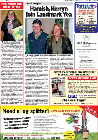 ● Hamish Fella and Kerryn Rishworth are part of the Landmark Yea team ■ Landmark Yea’s latest additions to the team Hamish enjoys camping, time with mates, are thoroughly enjoying their new lives in the and shooting. He is recently returned from ‘Tottenham’, below Dubbo, where a team of district. Hamish Falla, 18, joined Chris Pollard’s live- three scored 17 pigs. Hamish says he is impressed with the Yea stock team earlier this year, and says Yea is a way of life where people know others by name. good community with good people. He is on a learning curve with his first Yea Kerryn Rishworth, with 35 years’ sales and marketing experience, and now working in the winter with local people telling him it hasn’t got Landmark Yea real estate division, is making a cold yet. He is also looking forward to his first Turn To Page 6 new life in Yea with partner Ken Leveque, and Spring season here. the couple are looking forward to their wedding at their Yea property in November. ★ Hamish Falla was born in Tooboorac, and raised in Wangaratta. His father Rob managed cattle property in the north-east. As a teenager, Hamish started working as with Landmark Wangaratta one day a week for 2½-years. It’s confirmed. The Local Paper has the biggest He moved to Yea earlier this year, buying a readership of any newspaper in Murrindindi home in Welch St, near the butter factory. Shire. He says he is keen to grow in the job, and is ✔ FACT: The Local Paper has an unrivalled free enjoying his work under the supervision of Landdistribution network and print run. mark Yea manager Chris Pollard. ✔ FACT: The Local Paper also has the largest Hamish is keen on his work on sale days at online readership. www.LocalPaper.com.au the Yea Saleyards, and is noticing that there are ✔ FACT: The Local Paper has the widest digital more store cattle in the district compared to other coverage with opt-in free e-mail subscriptions. areas. He has also been introduced to some of An energetic local paper for the 21st Century the sheep farming in the district. Hamish says his longer-term ambitions with Verified Free Distribution Landmark Yea are to steadily develop a client Protect Your Advertising Dollars list. Outside of work, Hamish is playing as a midfielder for the Milawa Football Club in the Ovens and King League, currently fourth on the ladder. He smiles when we ask how he might Phone: 5797 2656. Web: www.LocalPaper.com.au look in yellow-and-black.
