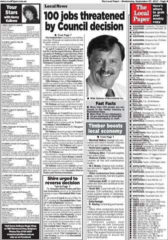 100 jobs threatened by Council decision ● From Page 7 Murrindindi Shire Councillors were told that more than 100 people are employed directly with the timber industry. Many more are associated with providing services to those companies which include: M. and P. Coulson, I. & M. Simpson and Son Pty Ltd, Devenport Electrics, Buxton Excavations, D. Bellman, Lopez Electrics, Peter Weeks, Landmark Embling, David Cooper, Webb Mechanical, Lima South Quarries, Keaths Excavations, Bonco Supplies, Bruce Thompson, TyrepowerAlexandra. Flow-on economic benefits from the timber industry are important for local fuel suppliers, auto electricians, truck repairers, road makers, welders, electricians and radio suppliers, pump suppliers, welders, hose fitters, road and gravel providers, as well as home and property owners renting yards and homes to contractors. Mike Dalmau, Chair of Murrindindi Inc., said he was asked by the President of the Alexandra Traders and Tourism to make the presentation to Councillors last Wednesday. The Council elected late last year has started positively, and the perception was that it was supporting jobs and businesses within the shire, he said. Mr Dalmau referred to the Council’s plan where it outlined its goals for the year 2030. Mr Dalmau said many people had recently commented that the Council was great at talking, but their actions were different: “They don’t walk the talk.” Mr Dalmau said Council’s decision to encourage the halt of native timber harvesting locally, without talking beforehand with those involved, put local jobs at risk. Council had not spoken with the Traders’ Association or Murrindindi Inc. He said he was taken aback by Cr Margaret Rae’s comments. Mr Dalmau referred to people in the Council gallery at last week’s briefing. They were local people who paid rates, and who were members of the community. “They strongly feel that you have not engaged with them and that you have put their livelihoods on the scrap heap,” Mr Dalmau told Councillors. “They do not count in Murrindindi.” Councillors faced a strong test of their creditability, Mr Dalmau said. He referred to a unanimous decision recently taken by neighbouring Yarra Ranges Council. Proposals to close timber harvesting areas with a national park were unlikely to create the tourism benefits promoted by some. Mr Dalmau called on the Council to review its May decision, and referred to the call on Council by the members of the Alexandra District Traders and Tourism Association.