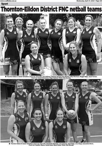 â—? Thornton-Eildon C-Grade Netballers (back row, from left): Jess Bellman, Melanie Gourlay, Sam Martins, Elley Morrison, Maggie Rigby, Jayne Farnan. Front row: Sarah Stevenson, Paige Gardner. Photo: Mel Gourlay.