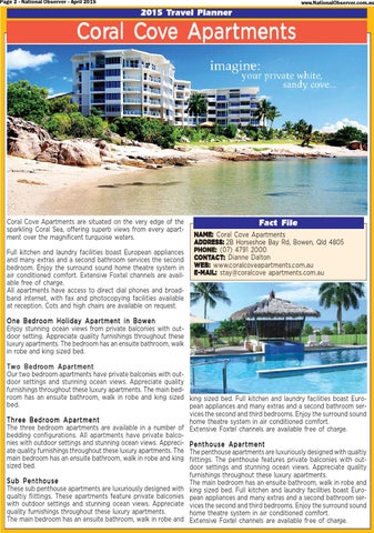 Fact File NAME: Coral Cove Apartments ADDRESS: 2B Horseshoe Bay Rd, Bowen, Qld 4805 PHONE: (07) 4791 2000 CONT ACT ONTA CT:: Dianne Dalton WEB: www.coralcoveapartments.com.au E-MAIL: stay@coralcove apartments.com.au