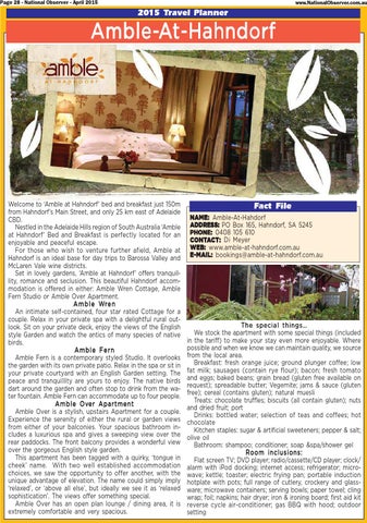 Fact File NAME: Amble-At-Hahdorf ADDRES S: PO Box 165, Hahndorf, SA 5245 ADDRESS: PHONE: 0408 105 610 CONT ACT ONTA CT:: Di Meyer WEB: www.amble-at-hahndorf.com.au E-MAIL: bookings@amble-at-hahndorf.com.au
