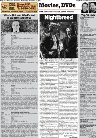 ● Craig Sheffer, David Cronenberg on the set of Nightbreed. ■ Director's Cut. 120 minutes. Avail- Aaron Boone (Craig Sheffer)and club able now on Region A Blu-Ray and singer Lori Winston (Anne Bobby), Region 1 DVD. a young couple who are experiencing In 1990, author-turned-film-maker problems due to Boone suffering from Clive Barker released his latest di- horrific nightmares, visions where he rectorial effort, Nightbreed. is pursued by monsters at a mysteriAfter the critical and commercial ous location known as Midian. success of his 1987 feature film deBoone has been seeing psychiabut Hellraiser (which unfortunately trist Philip K Decker (David spawned way too many sequels), Cronenberg), who thinks he might Barker wanted to adapt his novella actually be the person committing a Cabal for the big screen, and to give series of brutal murders in the area, audiences an unusual mix of fantasy, an accusation which has Boone doubtromance, and action. ing his sanity. There would be some horror eleIt doesn't take long to discover who ments, but Nightbreed was not in- the real killer is, leading Boone on jourtended to be a horror film. ney where he will discover that During production, problems arose Midian and the monsters he has between the studio and Barker. dreamt of are real, and he will play a The former were becoming un- major part in their destiny. comfortable with the latter's epic apThanks to Barker's version, proach, which was focusing more on Nightbreed now comes across as a the main protagonists' love story, as more complete picture blessed with a well as presenting its monster char- distinctive identity, allowing a large acters as misunderstood good guys. gallery of characters to have more The producers wanted a more trato breathe, giving the story a true ditional horror flick of the stalk-and- time sense of weight and purpose. slash variety, one they could easily The of Midian is a fascinatmarket to a specific demographic. ing one,world full of bizarre wonders, but This lead to rewrites, re-shoots, and there is also a greater feeling of comeventually, a complete re-edit (via munity, one that has been persecuted accomplished editor Mark Goldblatt, brought in during post-production), and oppressed over the centuries by turning Nightbreed from an expansive institutions who are afraid of the un2½-hour fantasy experience into a known. The extras produced for this longfast-paced horror/thriller, running a awaited release are outstanding, with scant 102 minutes. The version released in cinemas audio commentaries, an in-depth 72 received largely negative reviews, as minute documentary about the film's critics were expecting a horror movie extensive production problems, as in the vein of Hellraiser, not the con- well as other featurettes, deleted voluted remnants of a much different scenes, and more that dedicated fans will most certainly enjoy. feature. A limited three-disc edition (which I remember seeing Nightbreed in an almost-empty theatre, and despite is apparently already hard to get) conthe numerous changes and chopped- tains more goodies and the 1990 thedown story, proved entertaining due atrical cut. After more than two decades, Clive to Barker's still-evident imagination and David Cronenberg's eerie per- Barker's intended vision of Nightbreed can finally be seen by a formance. Now, after nearly 25 years of fanbase that has grown considerably searching, and negotiating with mul- over the years, beautifully restored tiple studios who owned the rights in and complimented with a vast array various ways, we can finally see Clive of bonus features, and is one of the Barker's cut of Nightbreed, culled most impressive blu-ray releases of from vast amounts of footage thought the year. The wait was definitely lost, lovingly restored and presented worth it. in a glorious special edition. RATING - ****½ The plot centres around mechanic - Aaron Rourke