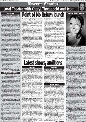 Latest shows, auditions SHOWS ■ Cardinia Performing Arts Company (CPAC): Annie Until February 24 at the Cardinia Arts and Cultural Centre, Lakeside Boulevard, Pakenham. Director: Lee Geraghty. Bookings: www.cardiniaperformingarts.com ■ Heidelberg Theatre Company: Crossing Delancey (by Susan Sandler) Until March 3 at 36 Turnham Ave., Rosanna. Director: Llaaneath Poor. Tickets: $27 Full, $24 Conc. Bookings: 9457 4117 or htc.org.au ■ Brighton Theatre Company: In the Next Room or the Vibrator Play (by Sarah Ruhl) Until March 3 at Brighton Theatre, Cnr Carpenter and Wilson Sts., Brighton. Director: Natasha Boyd. Bookings: 1300 752 126. ■ Malvern Theatre Company: Last Gas (by John Cariani) Until March 3 at Malvern Theatre, 29 Burke Rd., Malvern. Director: Helen Ellis. Bookings:1300 131 152 or www.malverntheatre.com.au ■ The 1812 Theatre: Calendar Girls (by Tim Firth) February 22 - March 17 at The 1812 Theatre, 3-5 Rose St., Upper Ferntree Gully. Director: John Mills. Bookings: www.1812theatre. com.au ■ Mordialloc Theatre Company: All the King's Women (by Luigi Jannazzi) Until March 3 at Shirley Burke Theatre, 64 Parkers Rd., Parkdale. Director: Barbara Crawford, Bookings: 9587 5141 or www.mordialloctheatre.com ■ Eltham Little Theatre: The Importance of Being Earnest (by Oscar Wilde) February 23 March 4 at The Eltham Performing Arts Centre, 1603 Main Rd., Research. Director: Brad Buckingham. Bookings: www.trybooking.com/ book/event?eid=344247 ■ The Basin Theatre Group: It's Never Too Late (by Ron Aldridge) Until March 10 at The Basin Theatre, Cnr Doongalla and Simpsons Rds., The Basin. Director: Christine Grant. Bookings: 1300 784 668 or www.thebasintheatre.org.au ■ Lilydale Athenaeum Theatre Company: Sylvia (by A. R. Gurney) March 1 - 17 at 39-41 Castella St., Lilydale. Director; Catherine