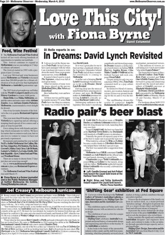 Food, Wine Festival ■ The Melbourne Food and Wine Festival kicked off last week offering hundreds of opportunities to tantalise our tastebuds. This festival continues to expand as Melburnians year on year indulge in 17 days of culinary adventures. The festival started in 1993 with a program of just 12 events. Last year 386 food and wine businesses across Melbourne and Victoria welcomed more than 200,000 people for a vibrant celebration of food and wine that highlighted Melbourne as Australia’s gastronomic capital. The 2015 festival got underway on Friday with the World’s Longest Lunch held in the Fitzroy Gardens for a mere 1608 guests. Shane Delia, from Maha, Melbourne, created the entree and main course while Adriano Zumbo, from Adriano Zumbo Patissier, Melbourne, masterminded a sweet delight for dessert. One of my favourite elements of the festival is the ever-popular Restaurant Express series. This year more than 80 leading eateries in Victoria have signed up and are offering a tempting lunch special of two courses and a glass of wine for just $40. I love sitting down with friends and plotting which restaurants we will try. We have favourites that we return to each year, but we also love to venture to venues we have not previously experienced. Restaurants participating this year include No35 at Sofitel Melbourne On Collins, Bistro Vue, Gingerboy, Pei Modern, The Deck, Cecconi’s, Maha, Gazi, Circa, Cafe Di Stasio, Lamaro’s, Matteo’s, La Luna, Estelle, Hellenic Republic – Kew, Union Food and Wine, and Woodland House. There are so many to choose from 17 days just does not seem long enough! Go to www.melbournefoodandwine. com.au to plan your Restaurant Express adventures. The Melbourne Food and Wine Festival runs until March 15. ● Fiona Byrne is a former journalist and is the Public Relations Manager at Sofitel Melbourne On Collins. Fiona@fionabyrne.com.au