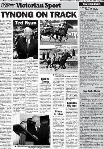 TYNONG ON TRACK ■ The new track at Tynong for the Pakenham Racing Club is coming along nicely according to their Racing General Manager, Michael Hodge. Congratulations are in order for Michael who has been elevated to the newly appointed position to overseer the new track. The position of CEO at Pakenham has been filled by Mark Graham, former Secretary at Kyneton, who also spent time with Racing Victoria. We wish Mark all the best, and I look forward to working with him in the future. Michael and his hard working Committee have put in many hours, with the intended move next year to the new established track down the road. He deserves the elevation as he put in all the time at Pakenham and has been justly rewarded. I worked at Pakenham on August 18 for their big jumps day, to honour the late Michael Bourke who with his family got the ball rolling when they family opened the track back in the twenties with Mr Bourke in charge from 1926 until 1949. He was later succeeded by his son David, who became Chairman, and later in life was rewarded for his efforts by being elected Chairman of the Victoria Racing Club. David took over as Secretary of the Pakenham Racing Club when he was only 18 years of age after ill health forced his father to retire. In 1926, Michael Bourke was instrumental in the reconstruction of the racecourse, as well as providing the necessary finance. The feature event on Jumps day was the M.J.Bourke Hurdle named in honour of Michael, Joseph Bourke, having first being run in 1957. The name of Bourke is synonymous with the Pakenham Racing Club through generations of involvement by the Bourke family. A number of former great jumping jockeys were invited along to enjoy the day, among