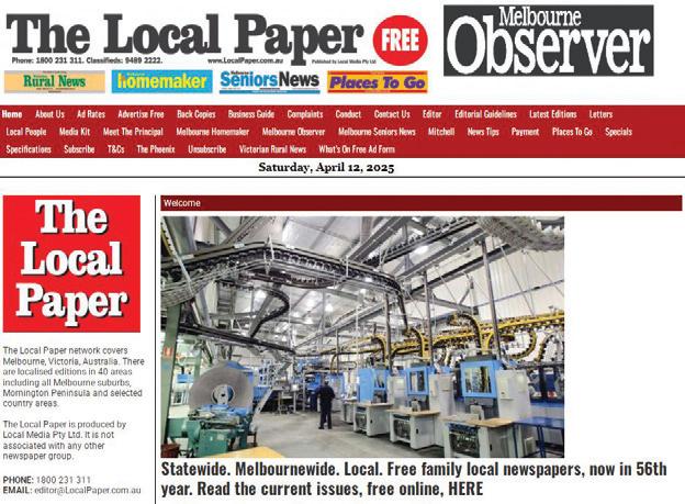 Go directly to www.LocalPaper.com.au or www.MelbourneObserver.com.au to read digital editions (exact replicas of print editions), free. Online edition dates in 2025 are: Feb. 5, Feb. 12, Feb. 19, Feb. 26, Mar. 5, Mar. 12, Mar. 19, Mar. 26, Apr. 2, Apr. 9, Apr. 16, Apr. 30, May 7, May 14, May 21, May 28, Jun. 4, Jun. 11, Jun. 28, Jun. 25, Jul. 2, Jul. 9, Jul. 16, Jul. 23, Jul., 30, Aug. 6, Aug. 13, Aug. 10, Aug. 27, Sep. 3, Sep. 10, Sep. 17, Sep. 24, Oct. 1, Oct. 8, Oct. 15, Oct. 22, Oct. 29, Nov. 5, Nov. 12, Nov. 19, Nov. 26, Dec. 3, Dec. 10. Lodge ads by 4pm Friday prior to publication.
