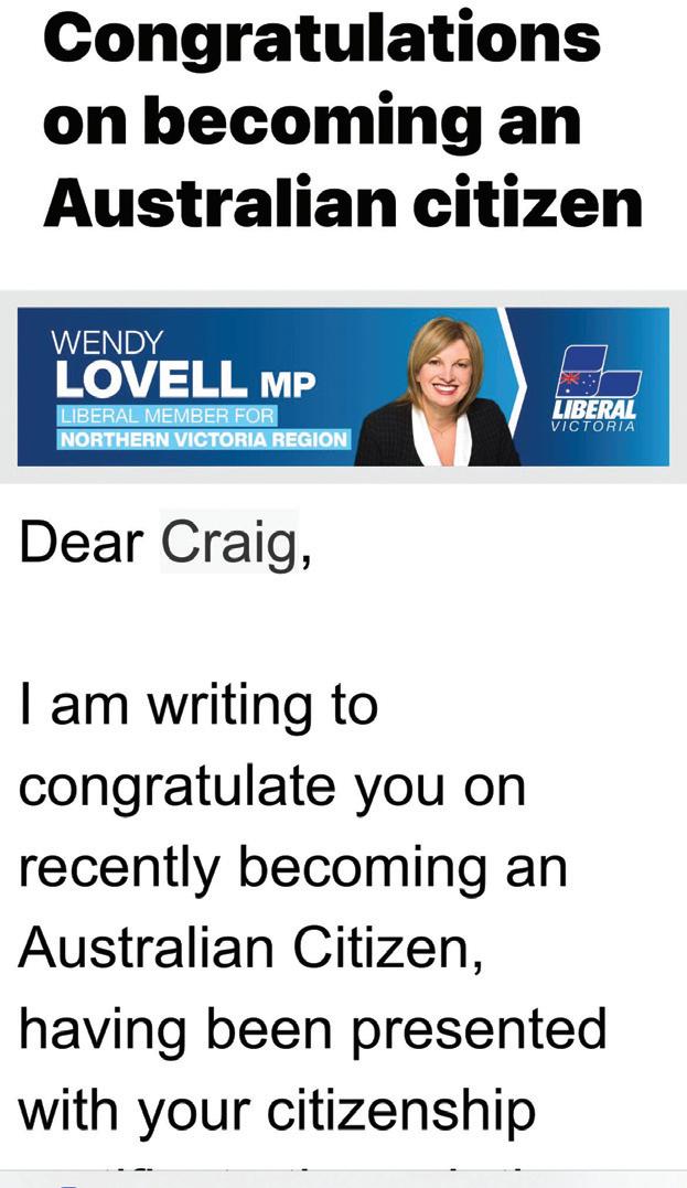 ■ Long-time local residents have incorrectly received messages from Northern Victoria MLC Wendy Lovell that congratulate them on becoming Australian citizens.