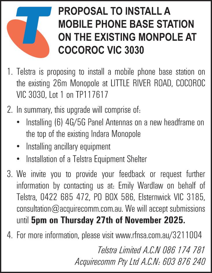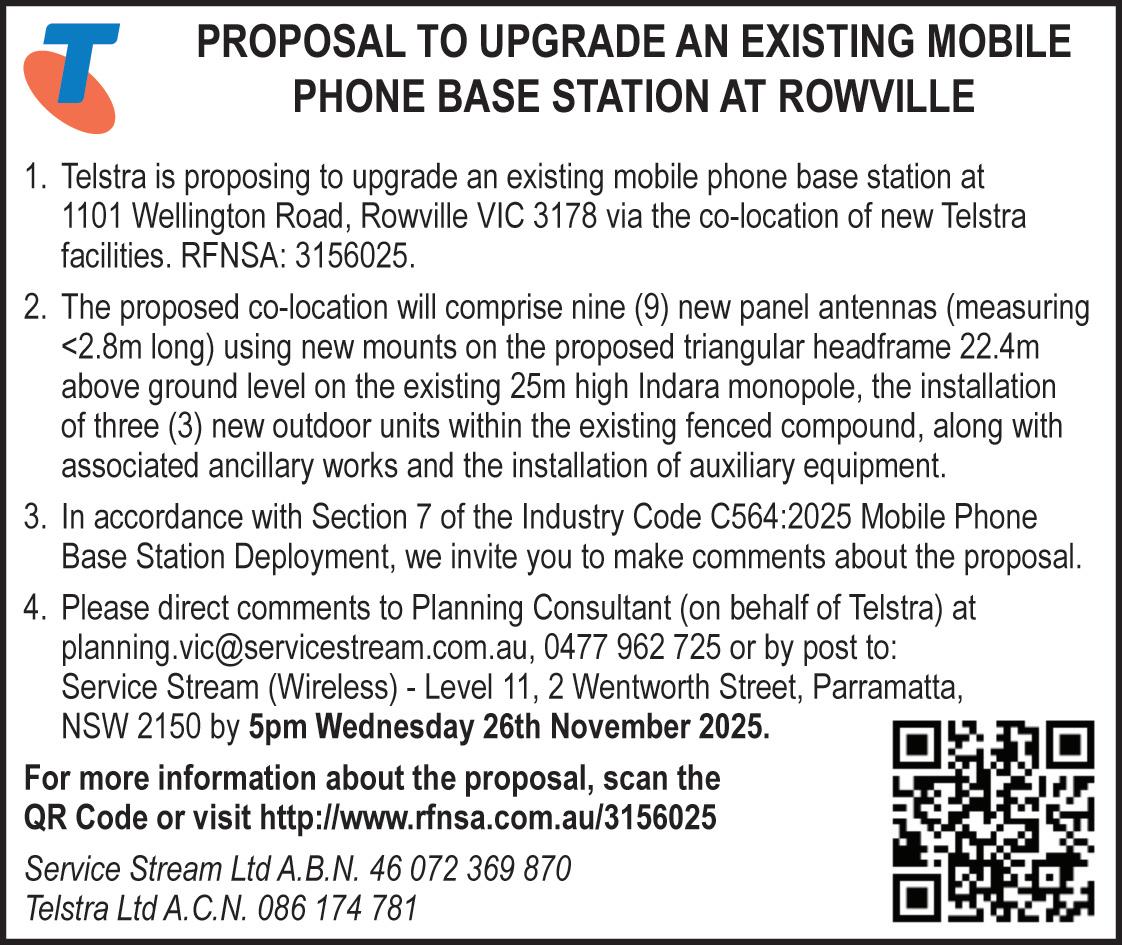 3. In accordance with Section 7 of the Industry Code C564:2025 Mobile Phone Base Station Deployment, we invite you to make comments about the proposal.