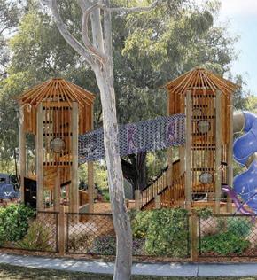 Early designs feature a custom treehouse inspired by Ewoks, misted water play, a climbing tower with slide, spinners, and lots of swings.