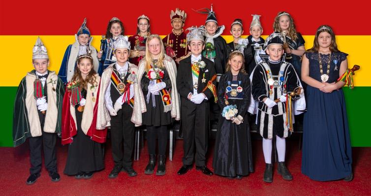 Voorste rij (v.l.n.r.): Prins Mathijs,Prinses Lonne en Minister Colin (JCV der Vooseschtoets, Epen), Prinses Faye (JCV de Klenderairkes, Cadier en Keer), PrinsesIsaenPrinsesRobin(JCVdeFoekepot,BergenTerblijt),PrinsLennon(JCVdeBierkes,Eckelrade),PrinsLennenPrinsesIlke(JCVdeKoekerelkes, Eijsden).