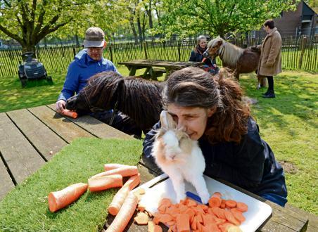 Bewoners verzorgen de dieren op de boerderij op het terrein.