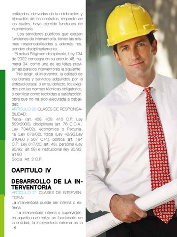 entidades, derivadas de la celebración y ejecución de los contratos, respecto de los cuales, haya ejercido funciones de Interventoría. Los servidores públicos que ejerzan funciones de Interventoría, tienen las mismas responsabilidades y además responden disciplinariamente. El actual Régimen disciplinario, Ley 734 de 2002 consagra en su artículo 48, numeral 34, como una de las faltas gravísimas para los Interventores la siguiente: “No exigir, el interventor, la calidad de los bienes y servicios adquiridos por la entidad estatal, o en su defecto, los exigidos por las normas técnicas obligatorias, o certificar como recibidas a satisfacción, obra que no ha sido ejecutada a cabalidad.” ARTICULO 20 CLASES DE RESPONSABILIDAD: Penal- (art. 408, 409, 410 C.P, Ley 599/2000), disciplinaria (art. 76 C.C.A., Ley 734/02), económica o Pecuniaria (Ley 678/02), fiscal (Ley 42/93,Ley 610/00 y 267 C.P.), política (art. 184 C.P. Ley 617/00, art. 48), personal (Ley 80/93, art 58) e institucional (ley 80/93, art 80 Social. Art. 2 C.P.