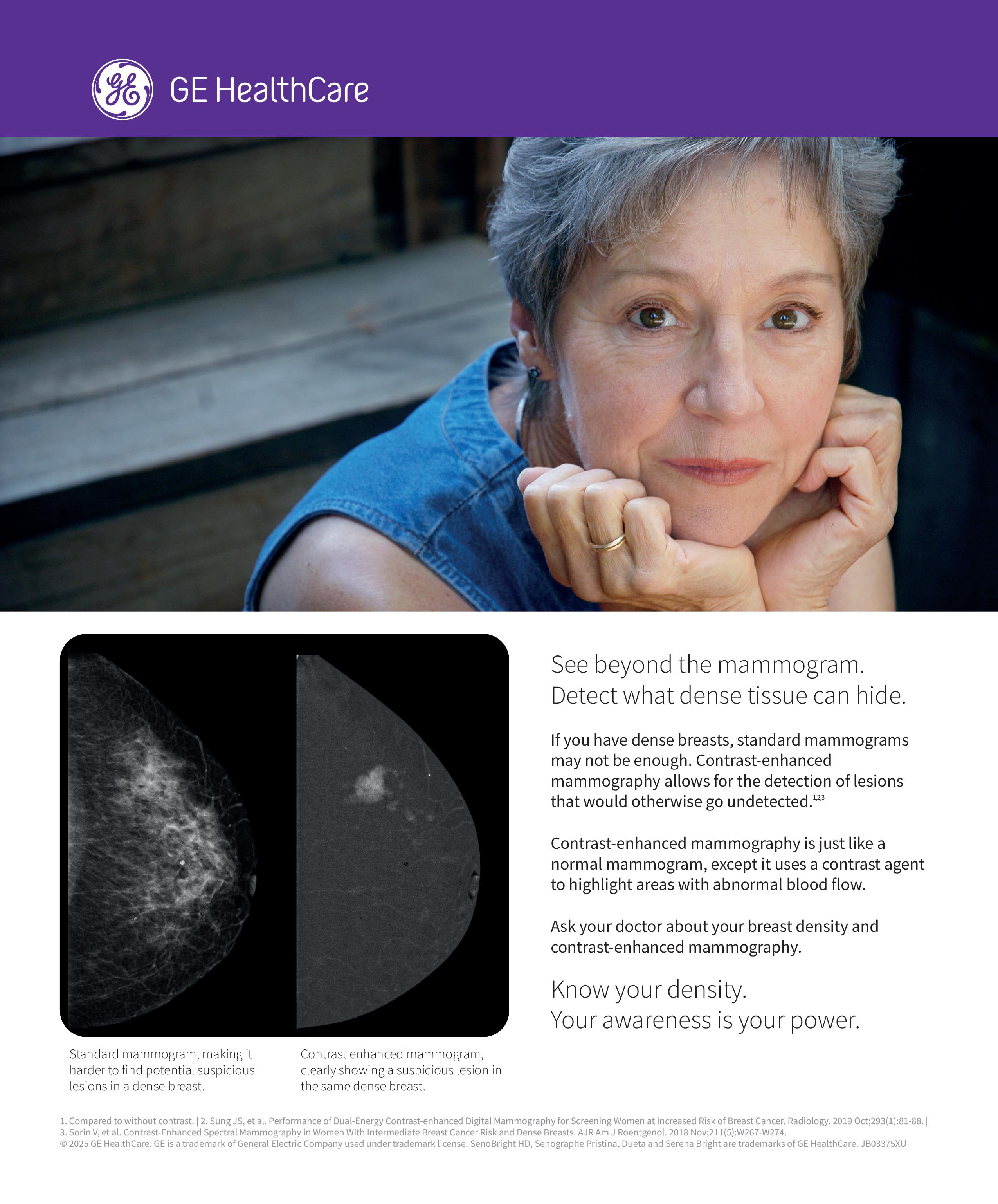radiation-free screening technology, is designed to identify cancers in dense breasts that may otherwise be missed by mammography. Contrast-Enhanced Mammography (CEM), which combines digital mammography with an iodinebased contrast agent to highlight areas of increased blood flow, a characteristic of cancer, offers an affordable option for problem-solving inconclusive results, using the same mammography machine. For women at higher risk, MRI screening provides a detailed look of the breast tissue.