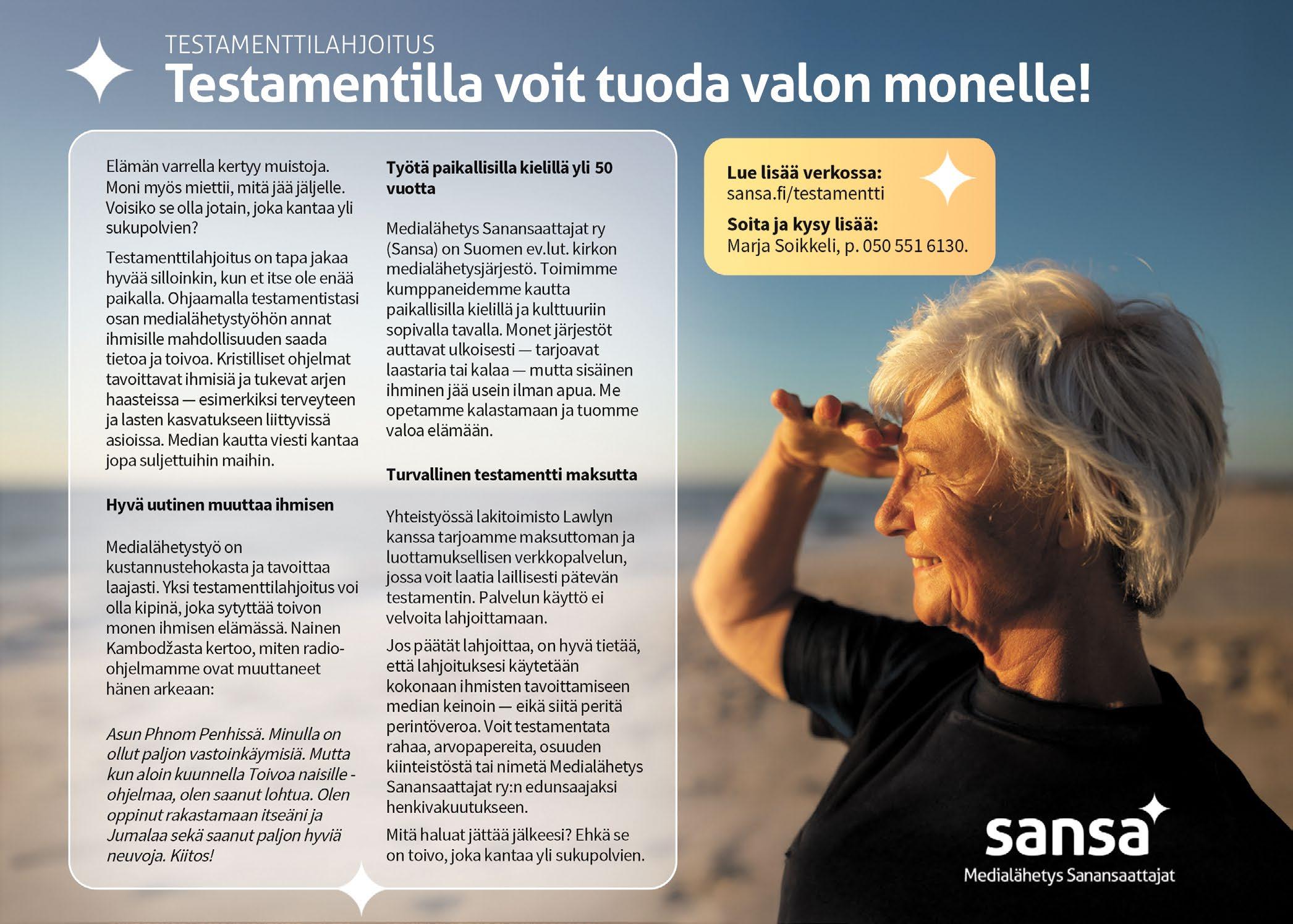 Raha ja tavarat kestävät vain hetken. Mutta kun kylvät sydämiin kristillisen toivon, se voi muuttaa koko elämän. Toivoon ankkuroitu elämä kestää myös myrskyt. Medialähetys Sanansaattajat ry, Suomen ev.lut. kirkon lähetysjärjestö, vie toivon sanomaa maailmalle. Tutustu testamenttilahjoitukseen – lahjaan, joka koskettaa monia ja vaikuttaa pitkään.