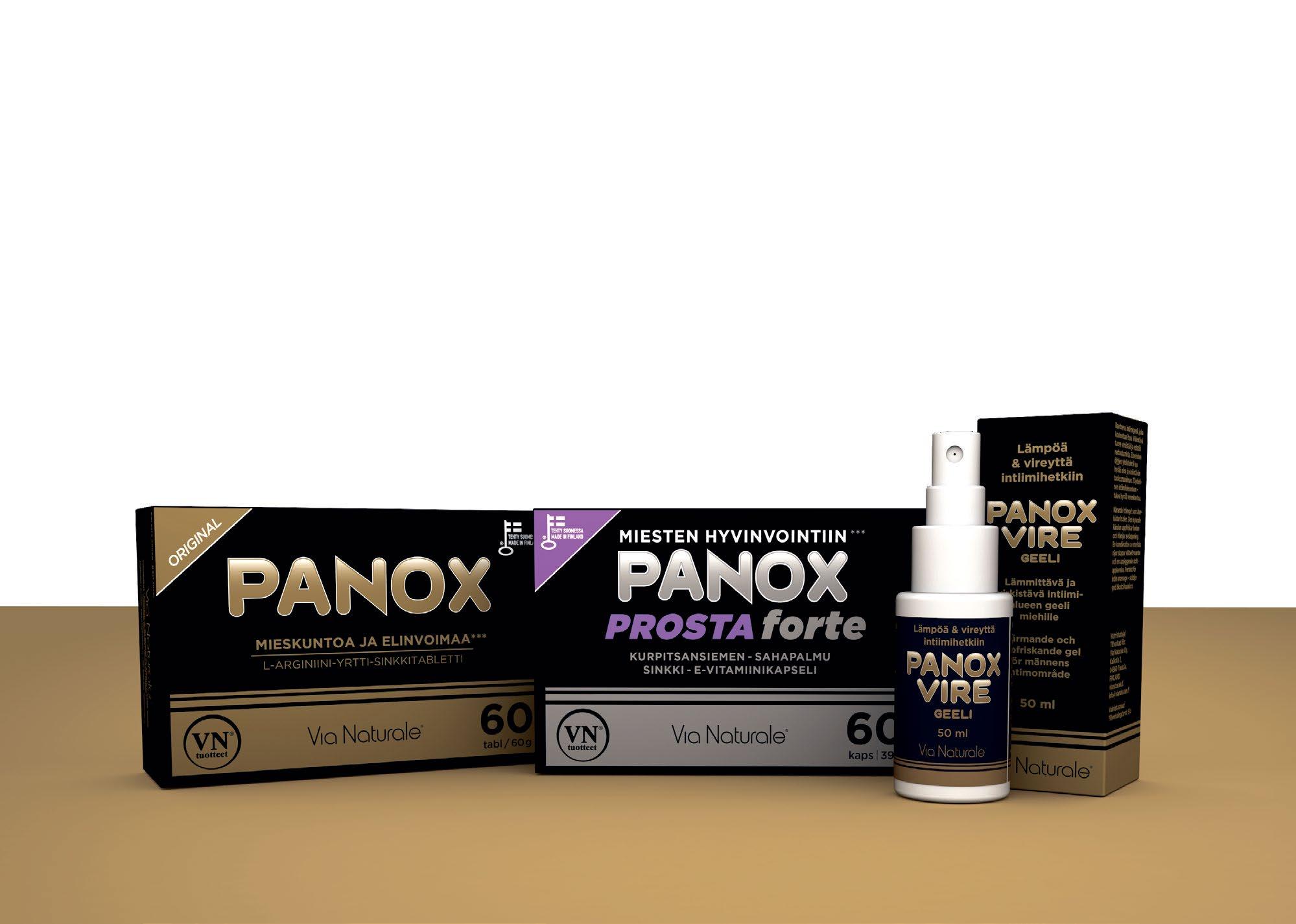 Panox Prosta Forte aikuisten miesten hyvinvointiin, keski-ikäisille yli 40vuotiaille miehille. Valmiste sisältää kurpitsansiementä, sahapalmua, sinkkiä ja E-vitamiinia. Sinkki edistää veren testosteronitasojen pysymistä normaalina ja E-vitamiini puolestaan edistää solujen suojaamista hapettumisstressiltä.
