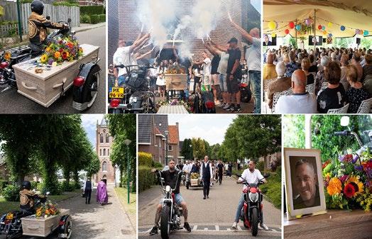 en vrienden aanwezig waren. De dienst vond plaats in een zomers versierde stretchtent, met Joost op een rouwmotor als middelpunt. Tijdens de indrukwekkende afscheidsdienst ging de stoet, begeleid door ronkende motoren en uitvaartverzorger Jeroen Mol, naar het kerkplein. Daar werden fakkels ontstoken als eerbetoon aan Joost, terwijl pastoor Schaepman de ceremonie afsloot. Na afloop verzamelde iedereen zich