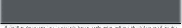 Meer dan 45 modellen meer dan 280 modellen meer dan 90 modellen (Veelal uit voorraad leverbaar) Handmatige relaxfauteuils Relaxfauteuils met Sta- op hulp kamerfauteuils Klassieke relaxfauteuils Meer dan 230 modellen meer dan 40 modellen meer dan 50 modellen * nvt op aktiemodellen, niet icm overige akties & aanbiedingen € 300,- retour voor Al bijna 50 jaar staan wij garant voor de beste fauteuils en de mooiste banken. Welkom bij zitcomfortspeciaalzaak Teun Arts. Onze meubelen zijn veelal Assortiment Inruil Levertijd Bezorging Boersestraat 11, 5454NG, Sint Hubert. In St.Hubert op de rotonde richting Wanroij, dan 3e weg links, 1e rechts. In onze 2000m² showroom door heel topfabrikaat met minimaalmogelijk in onze Enkel West EuropeesNaar wens aanpassingen Door bijna 50 jaar ervaring Advies Nu tot wel stoffeerderijafdeling relaxfauteuils van Nederland uw oude meubel* dus binnen 1 week Nederland vindt u de grootste collectie Garantie Gratis levering Onze openingstijden: Di, Wo & Do 10:00 - 17:30, Vrijdag 10:00 - 21:00, Zaterdag 10:00 - 17:00 tel.: 0485 - 45 29 86 www.teunarts.nl info@teunarts.nl bij ons het beste advies met zitmeubelen krijgt u 5 jaar fabrieksgarantie uit vooraad leverbaar Mogelijkheden www.teunarts.nl Al bijna 50 jaar hèt adres voor comfort en kwaliteit Opruiming! Ruim 250 Weg = Weg aanbiedingen direct uit voorraad leverbaar. Nu: eindejaars show! Meer dan 250 Weg=Weg aanbiedingen!
