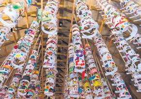 allemaal ook zelf een kroon. Van doppen, kurken en crêpepapier tot veren, kralen en lapjes stof. Een jubileum vraagt om speciale acties. In plaats van dat deze ‘kroonjuwelen’ na het bezoek mee naar huis gingen, zijn ze verzameld en bewaard in het museum. In totaal zijn dat er zo’n 725 en van deze overweldigende collectie is één groot kunstwerk gemaakt. Deze hangt als een grote wolk in de zogeheten ‘Feestzaal’ en is onderdeel van de huidige tentoonstelling Krona als hoofdzaak. Het kunstwerk is te zien tot 23 oktober.