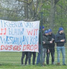 Langs de lijn staan heel veel supporters, velen met een blauw hoedje. Zij hebben met twee dubbeldekkers de reis naar Mariaheide gemaakt om hun ploeg aan te moedigen. Na zeven minuten zien ze de