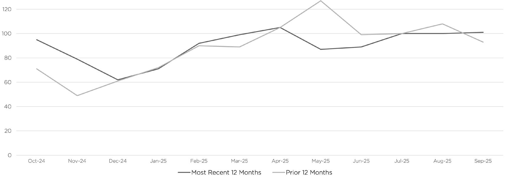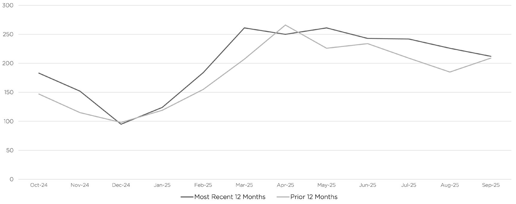 Source: Data provided by SmartCharts by ShowingTime, based on listing activity from BrightMLS (October 2020 - September 2025). All material presented is intended for information purposes only. This material is based on information that we consider reliable, but we do not represent that it is accurate or complete and it should not be relied upon as such. If your property is currently listed with another real estate broker, please disregard our marketing efforts. It is not our intention to solicit.